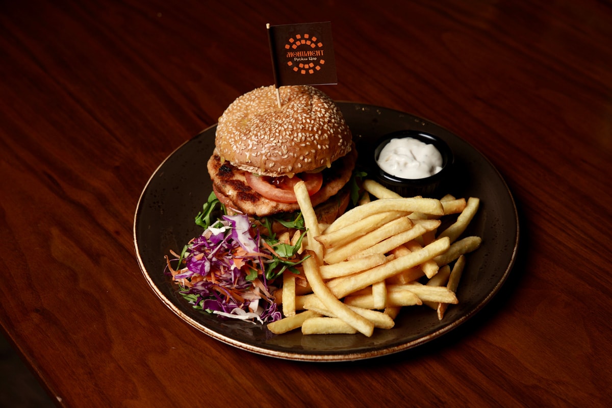 beef, fryed mozzarella, letucce mix, pickled cucumber, burger sauce, tartar sauce, french fries