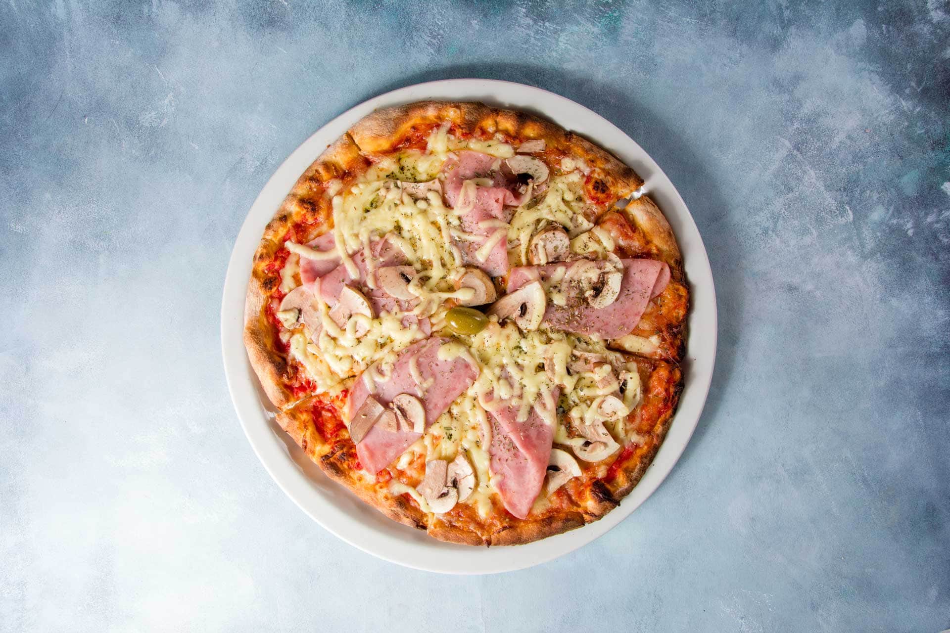 tomato sauce, cheese, ham, mushrooms