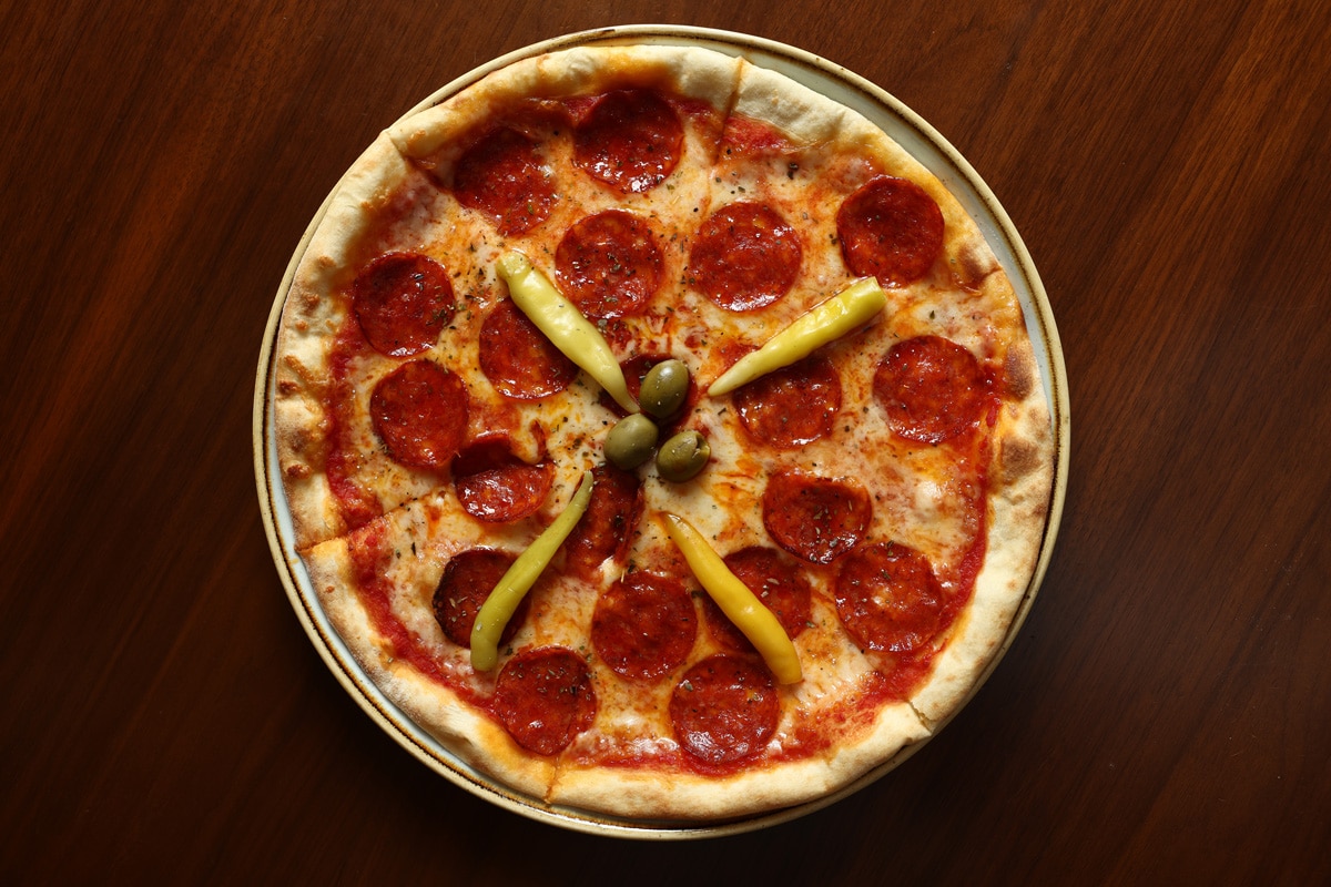 tomato sauce, mozzarella cheese, spicy sausage, chilli peppers, olives