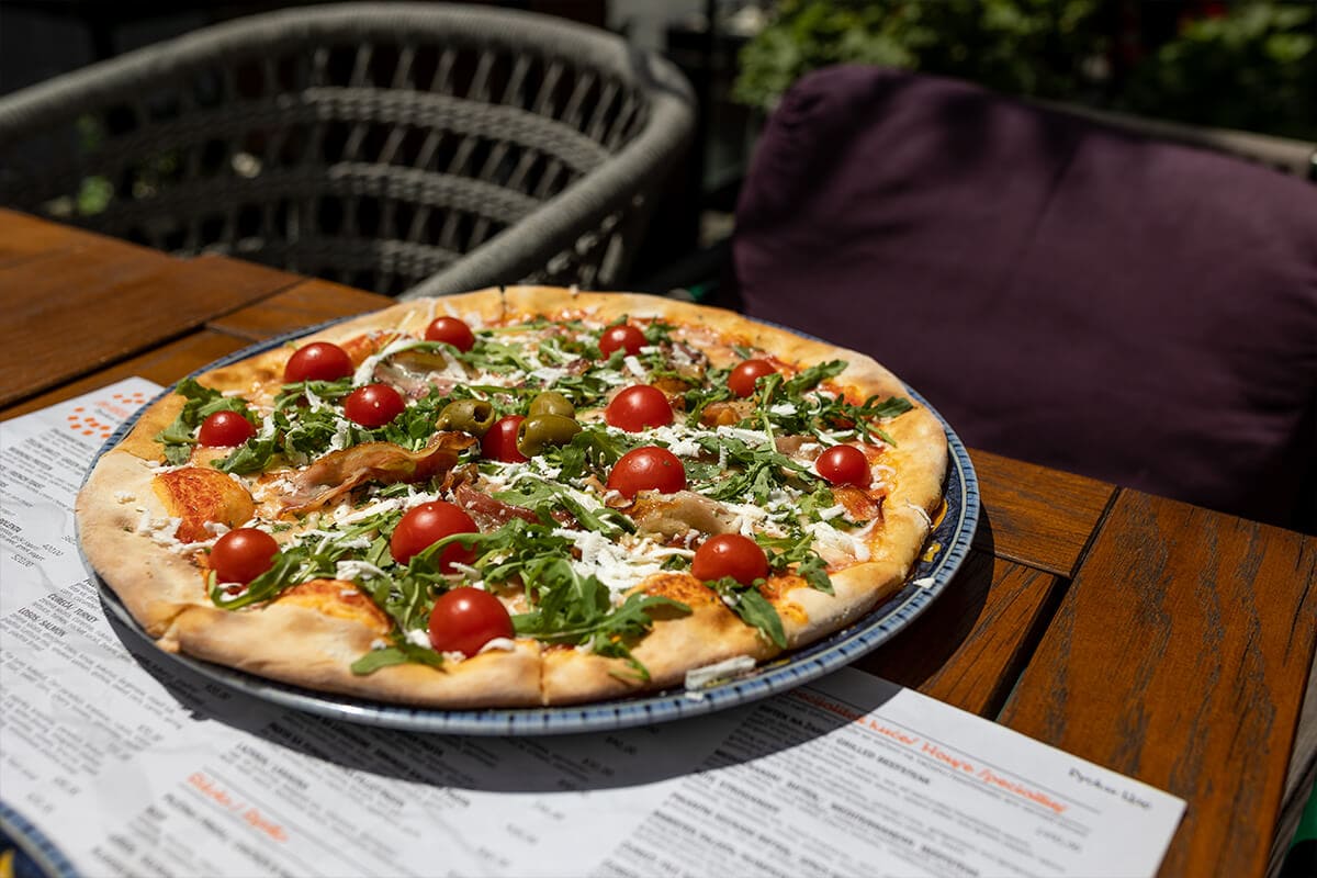 tomato sauce, mozzarella, ham, bacon, spicy sausage “kulen”, mushrooms, egg