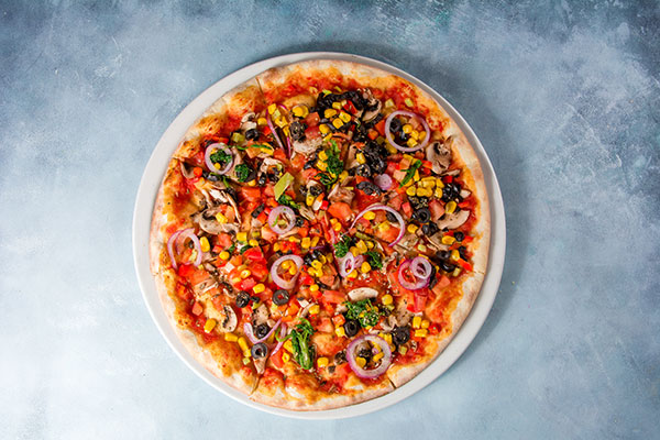 tomato sauce, peppers, tomato, mushrooms, olives, red onion, spinach, oregano